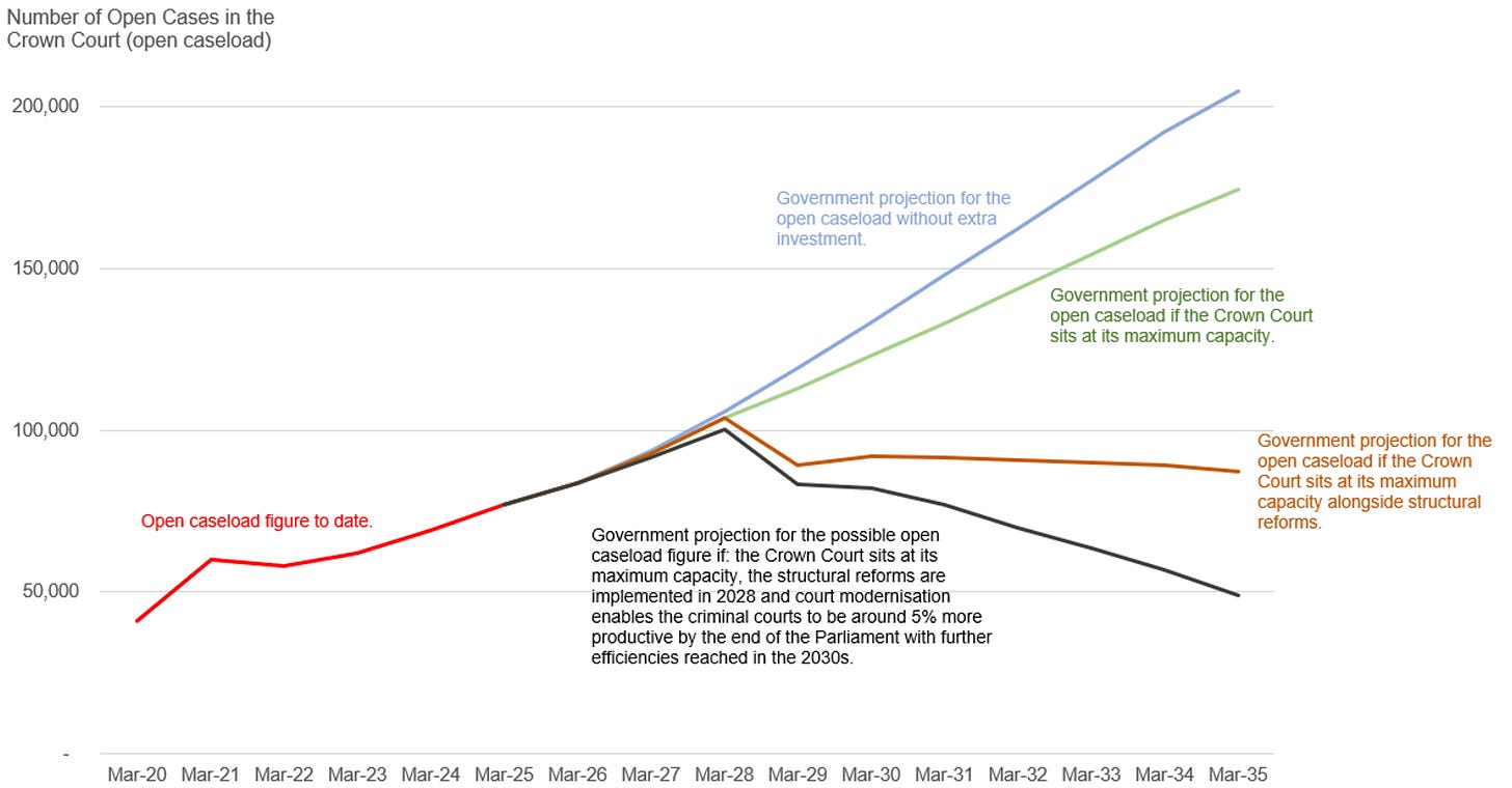 The graph is not very easy to read but what it indicates is that the backlog will fall below 50,000 by March 2035 — but only if the crown court sits at maximum capacity, structural reforms are implemented in 2028 and modernisation enables the courts to become more productive.