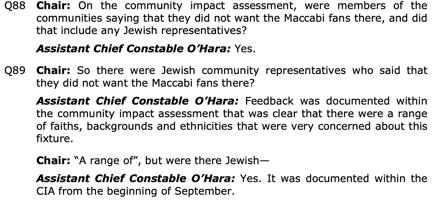 We can confirm that there is no documented feedback from Jewish representatives prior to the decision being communicated which expressed support for the ban on Maccabi Tel Aviv fans…
