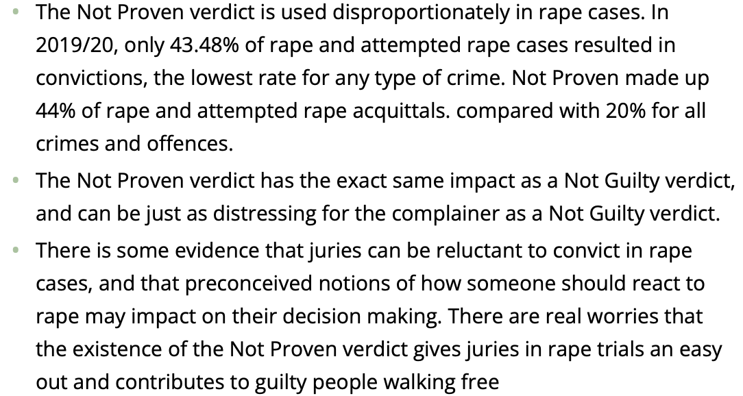 In 2018, the campaign group Rape Crisis Scotland launched a campaign to end the not proven verdict in cases of rape and attempted rape. It argued: