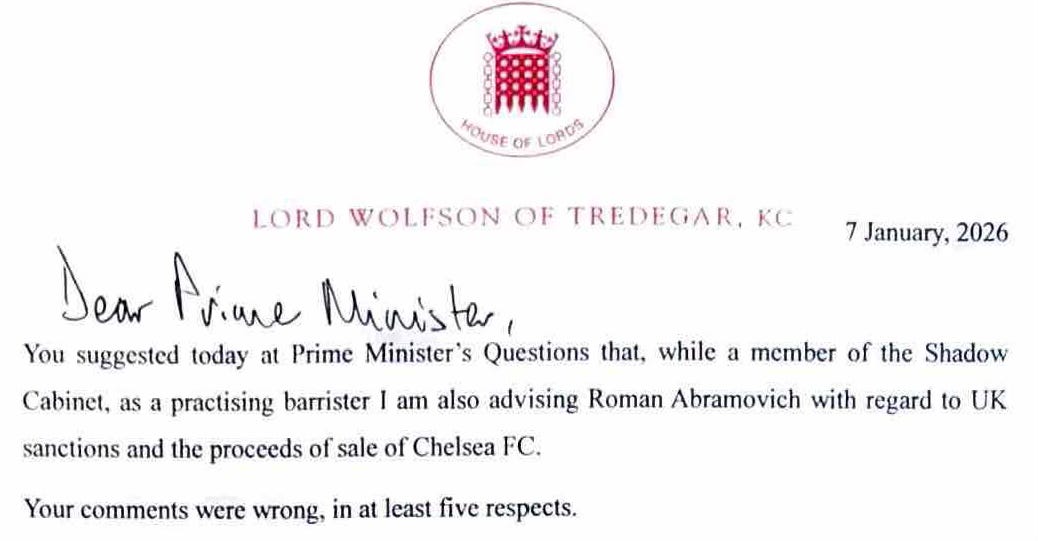Interviewed by Adam Boulton on Times Radio last Sunday, I explained that Wolfson had attended the shadow cabinet only once in the past year and that the issue on which he was representing Abramovich — which had nothing to do with the sale of Chelsea football club — was not being litigated in the United Kingdom.