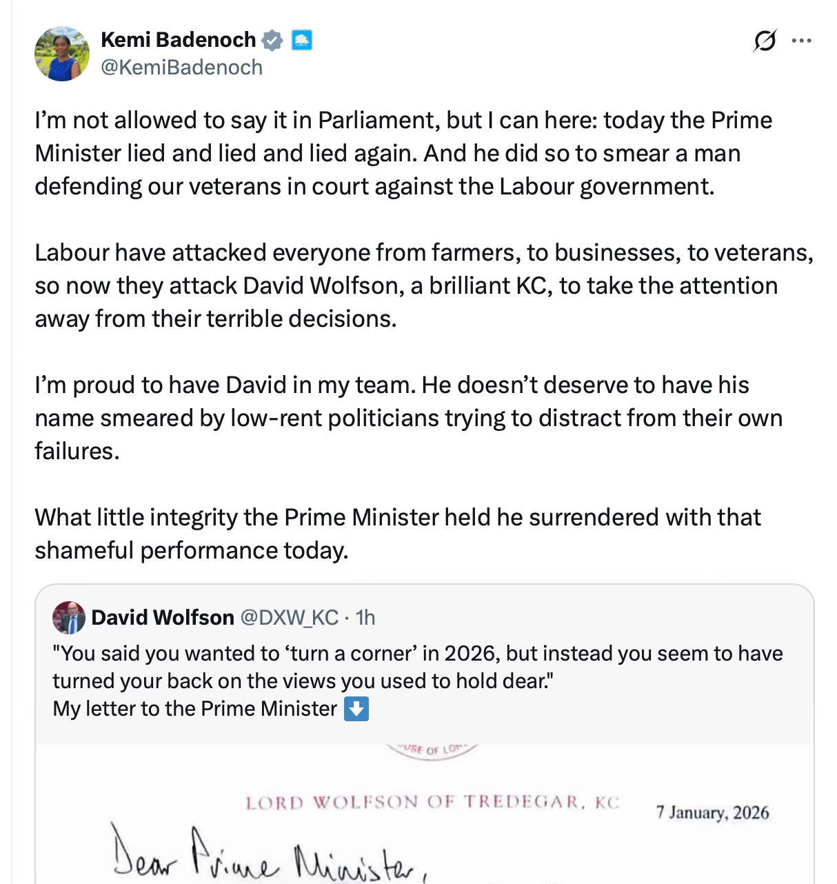 An hour after Wolfson had posted this letter on X, Badenoch endorsed it in unusually strong terms: