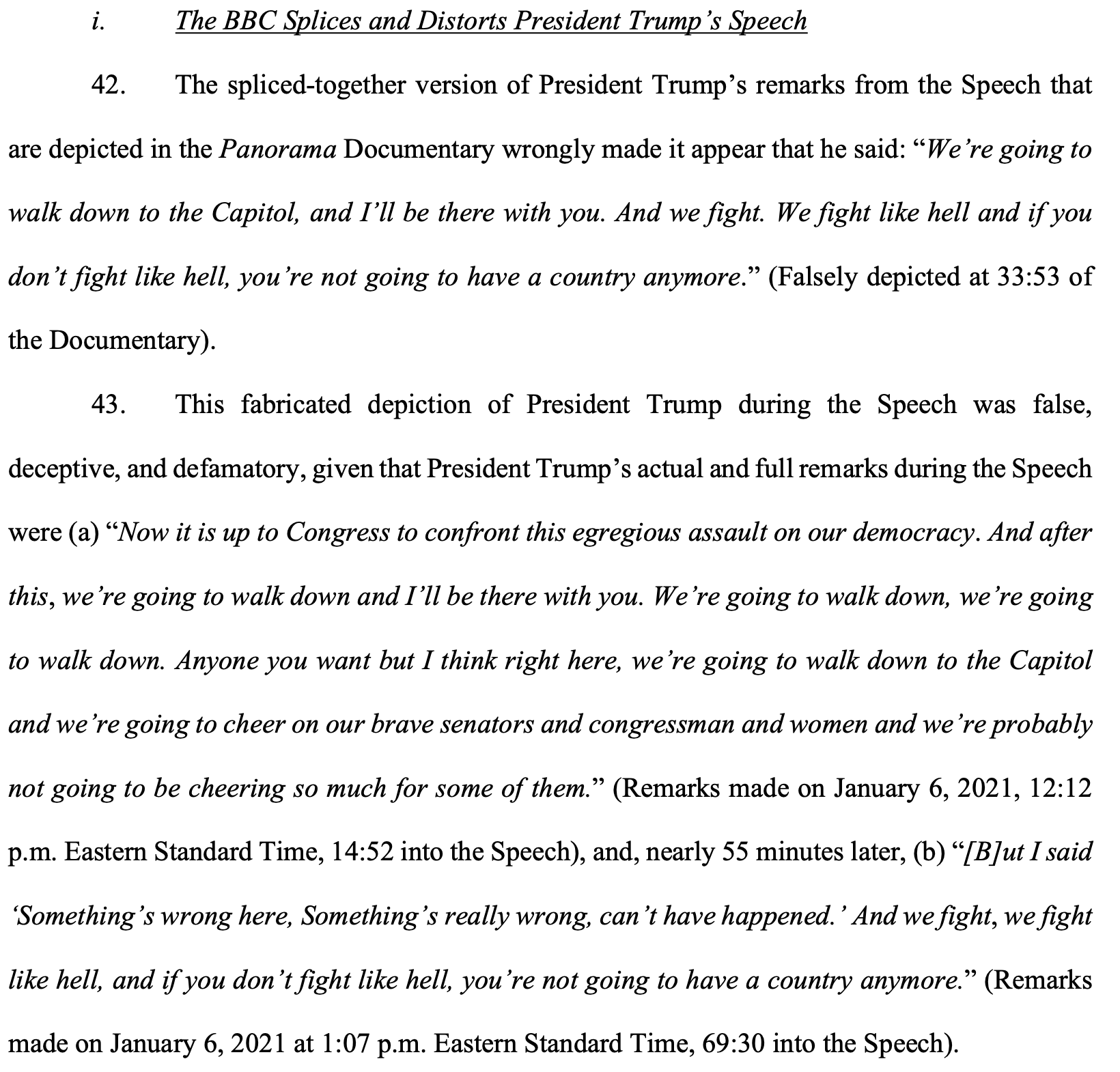 “Contrary to the BBC’s claim that its splicing, manipulation, and distortion of the speech was an unintentional editorial error,” the president argues, “substantial evidence suggests that this was an intentional and malicious effort to falsely and deceptively portray President Trump as having called for violent action on January 6, 2021.”