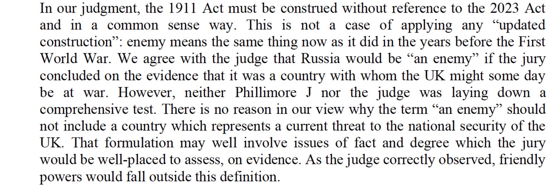 She says: “there is no reason in our view why the term ‘an enemy’ should not include a country which represents a current threat to the national security of the UK.”