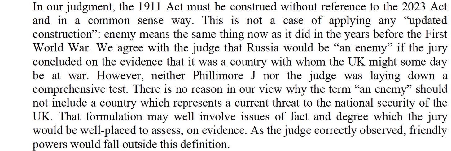 It does not mean that you can ignore the test of “enemy”: the jury still needs to be satisfied that, as a matter of fact and degree, the threat was such that China was an enemy.
